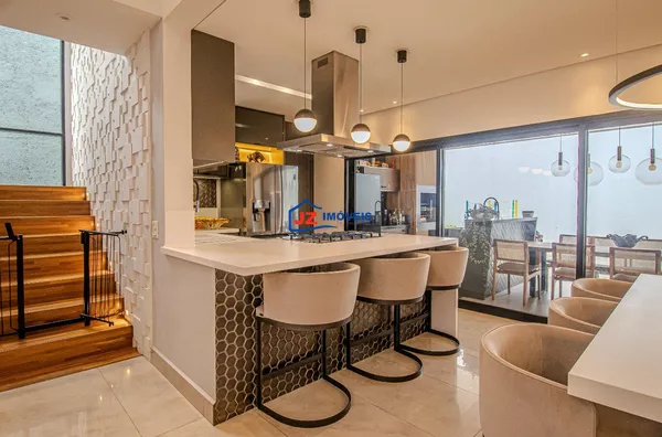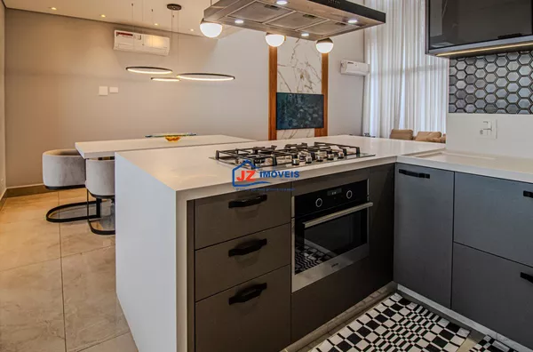 Cozinha gourmet com móveis planejados, cozinha americana, fogão embutido e armários