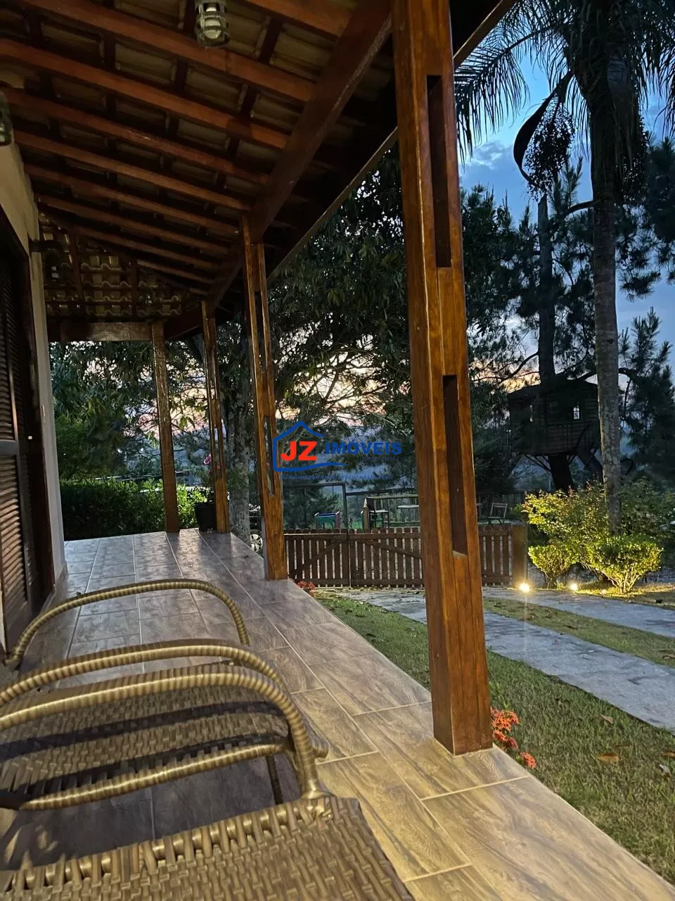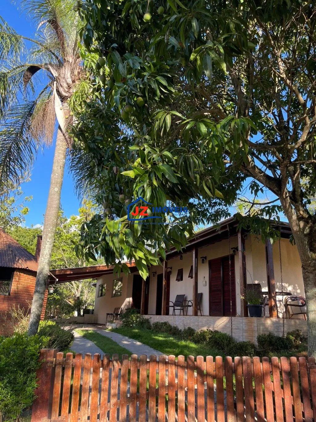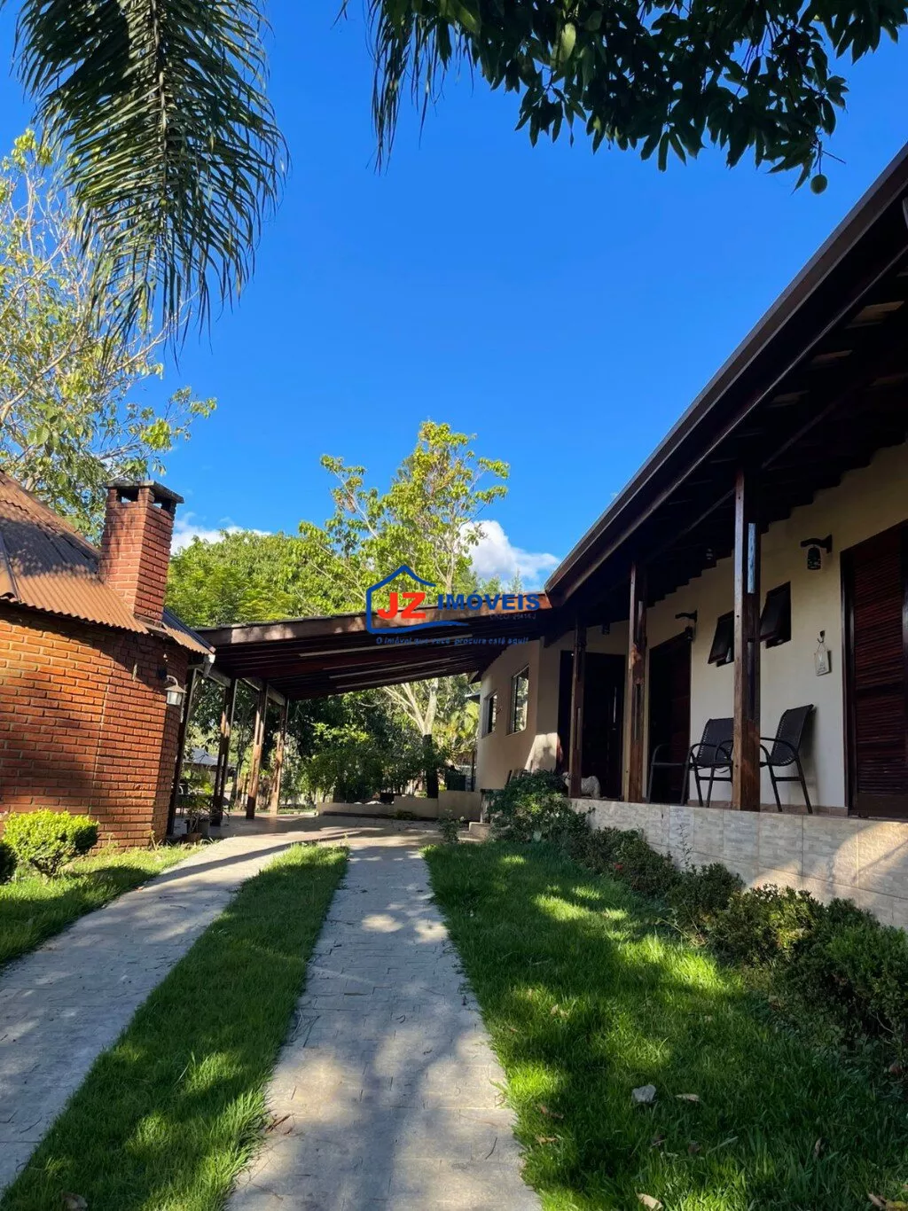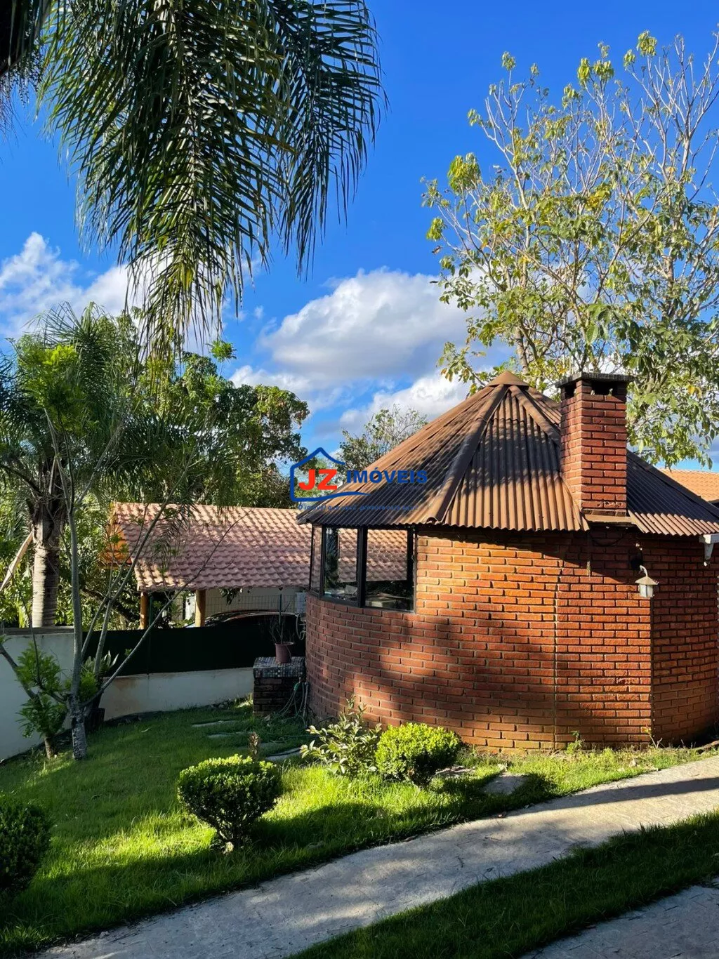 Área externa completa com quiosque, churrasqueira e banheiro de apoio, além de garagem coberta para 4 veículos.