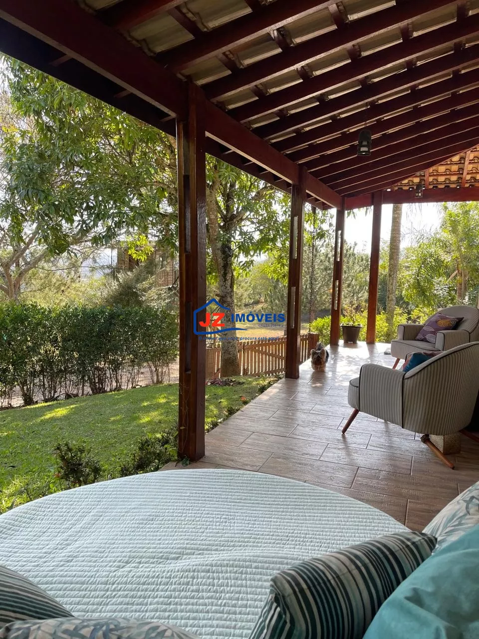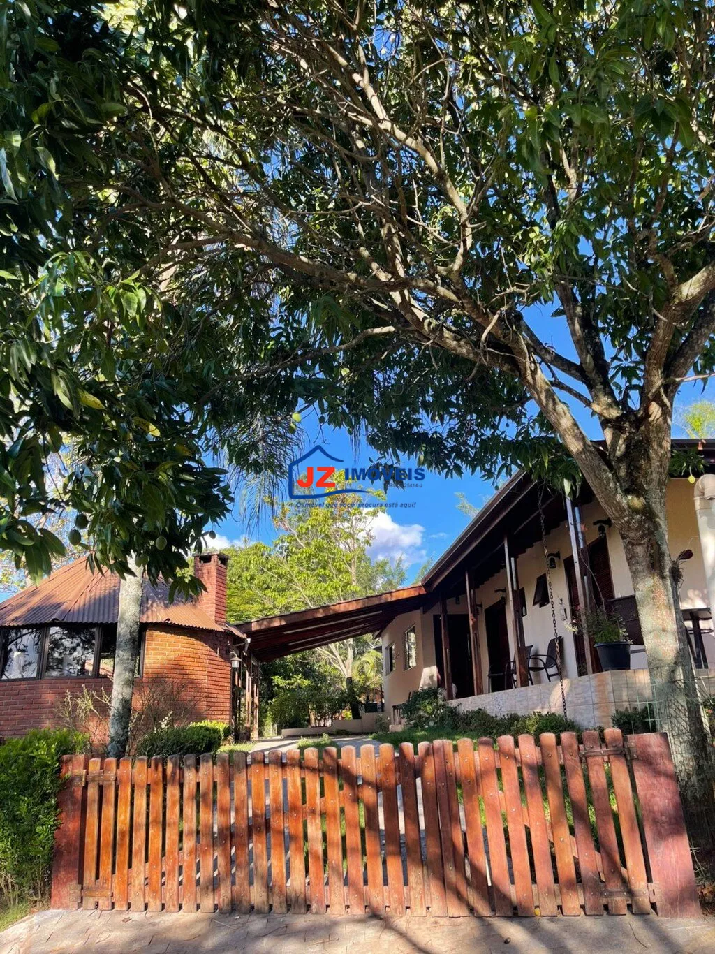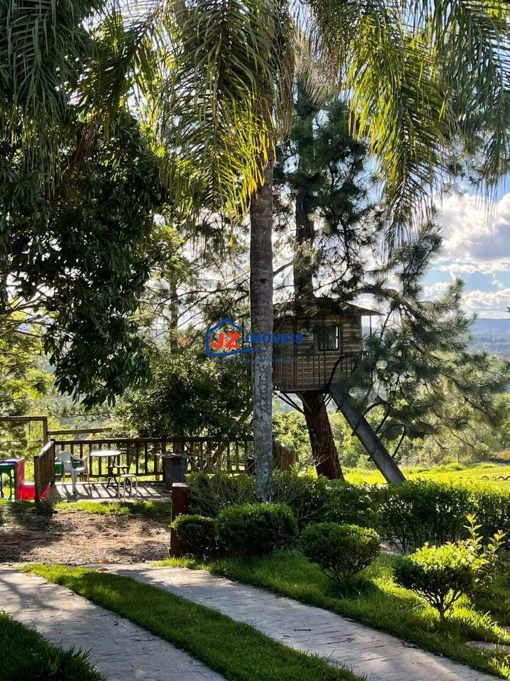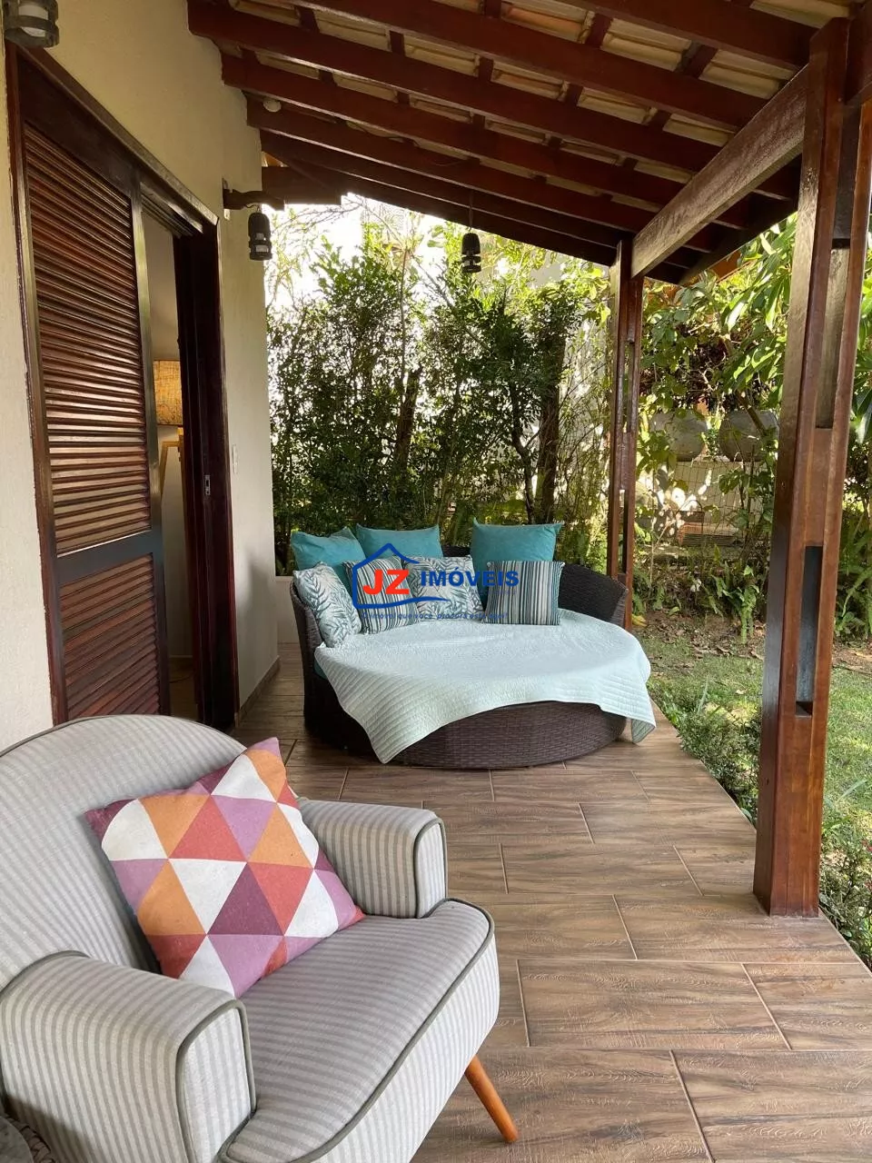 Área externa completa com quiosque, churrasqueira e banheiro de apoio, além de garagem coberta para 4 veículos.