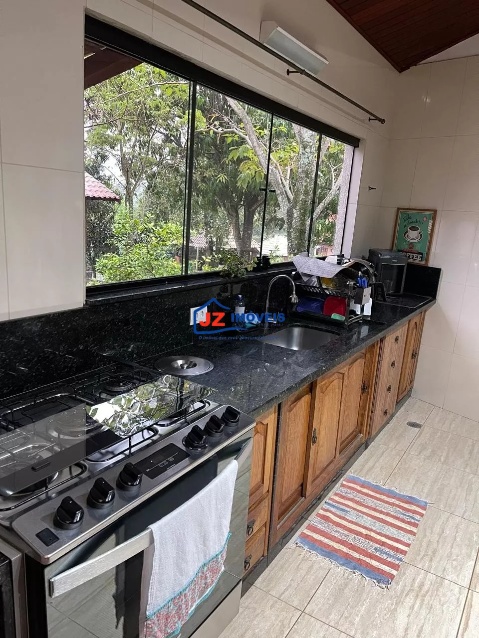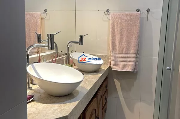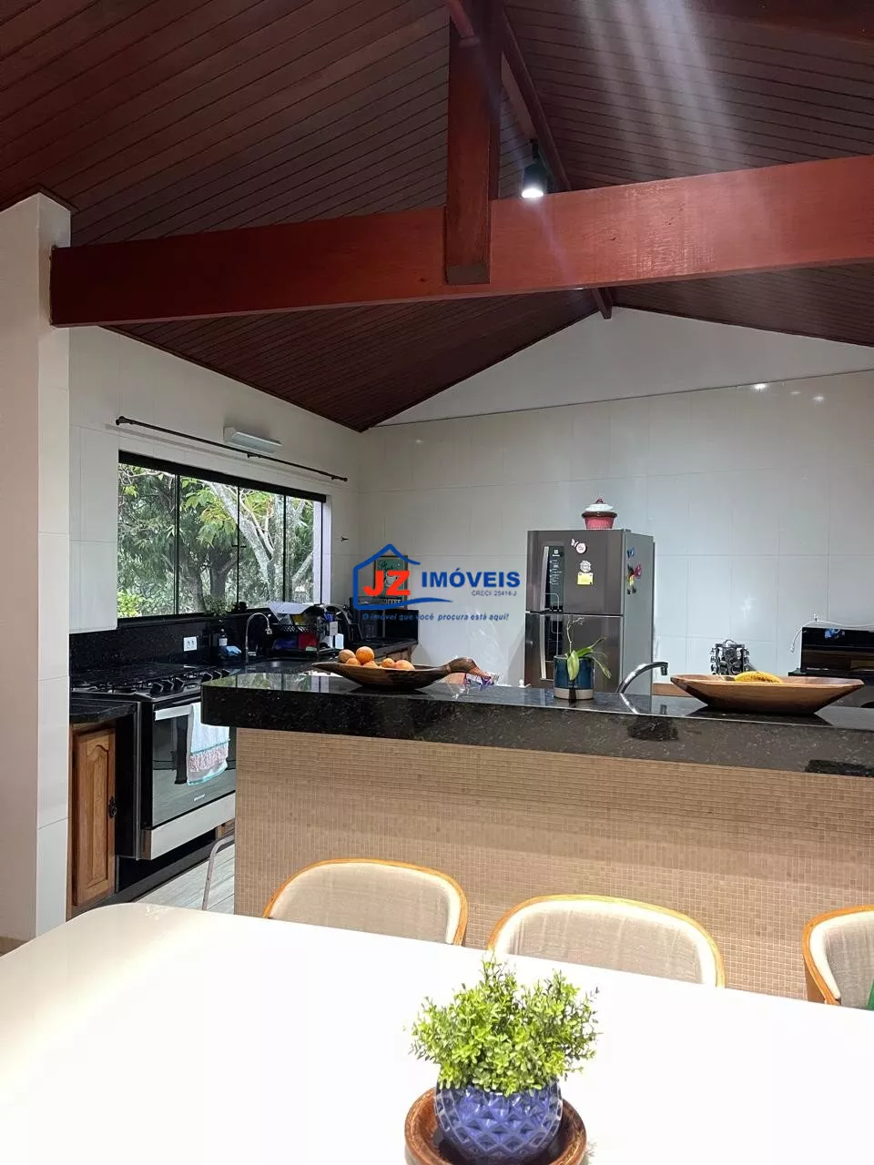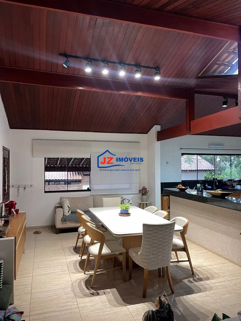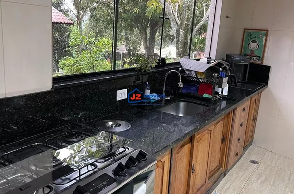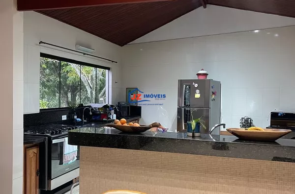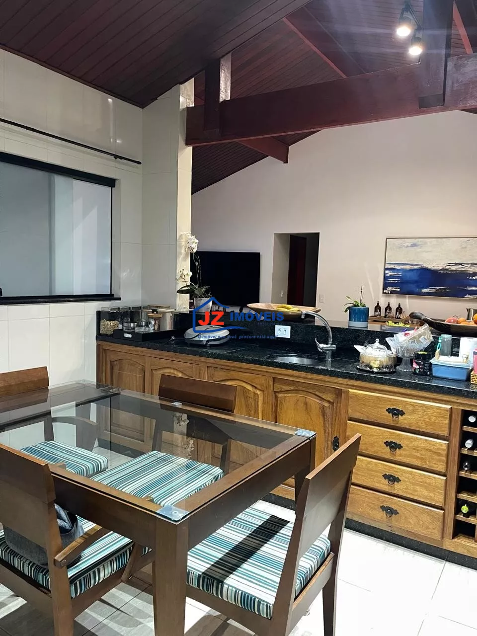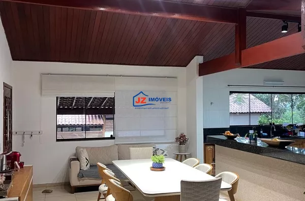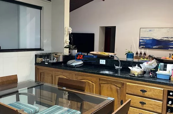 Residência térrea avarandada, com 220 m² de área construída em terreno de 460 m². Possui 3 suítes, lavabo e cozinha americana funcional com duas bancadas. Ambientes climatizados, com ar-condicionado na sala e na suíte principal.